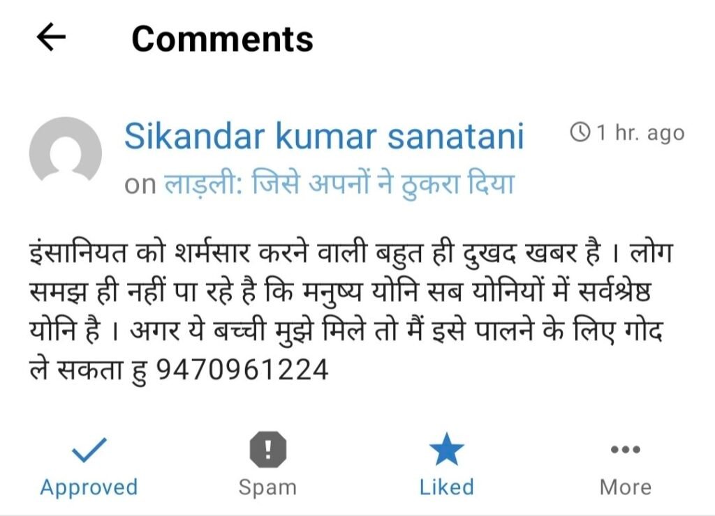 दारू खरिका निवासी सिकंदर कुमार ने इस घटना पर गहरी संवेदना व्यक्त करते हुए बच्ची को गोद लेने की इच्छा जाहिर की है। उन्होंने HF News 24 में प्रकाशित खबर के कमेंट सेक्शन पर प्रतिक्रिया देते हुए लिखा—
