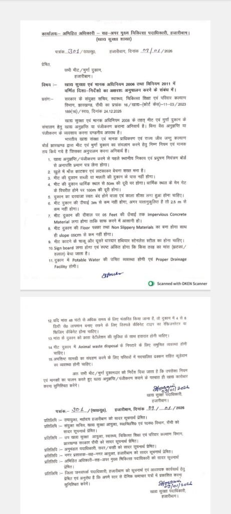 हजारीबाग में मीट और मुर्गा दुकानों पर लागू यह आदेश खाद्य सुरक्षा को लेकर अब तक का सबसे सख्त कदम माना जा रहा है।