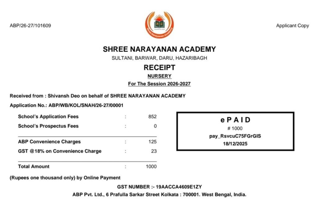 विद्यालय में शैक्षणिक सत्र 2026–27 के लिए नर्सरी कक्षा में ऑनलाइन आवेदन किया गया, जिसे सफलतापूर्वक स्वीकार किया गया। आवेदन के साथ ही ऑनलाइन माध्यम से भुगतान भी किया गया और उसकी डिजिटल रसीद तुरंत जारी हुई। इससे यह स्पष्ट हो गया है कि श्री नारायणन एकेडमी की डिजिटल नामांकन व्यवस्था पूरी तरह सक्रिय और भरोसेमंद है।